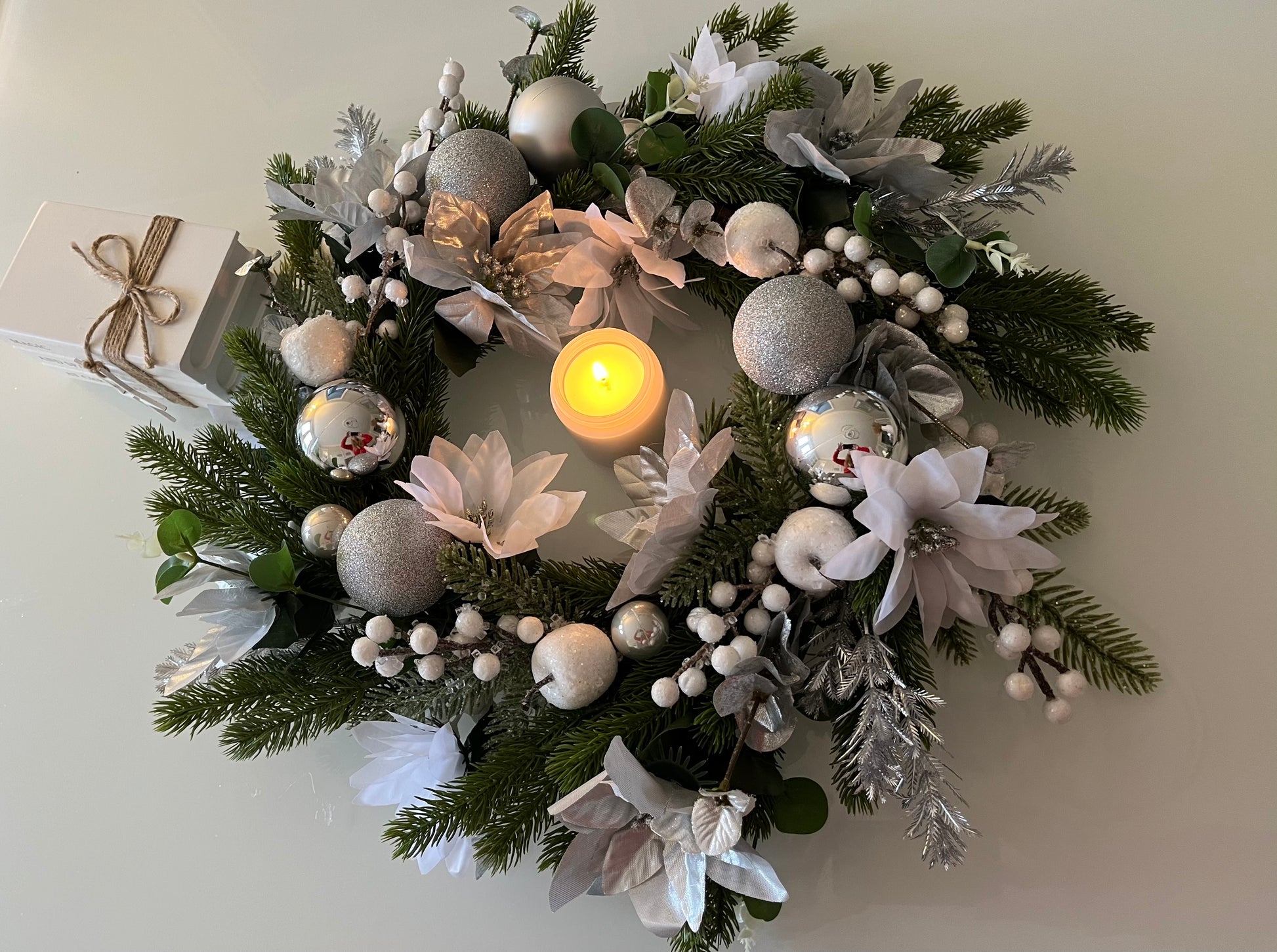 A gorgeous, striking wreath perfect for the Christmas season. Made with silver and white poinsettias and full of foliage and decorative items. Made on a 30cm grapevine base. A lovely addition to your Christmas collection.