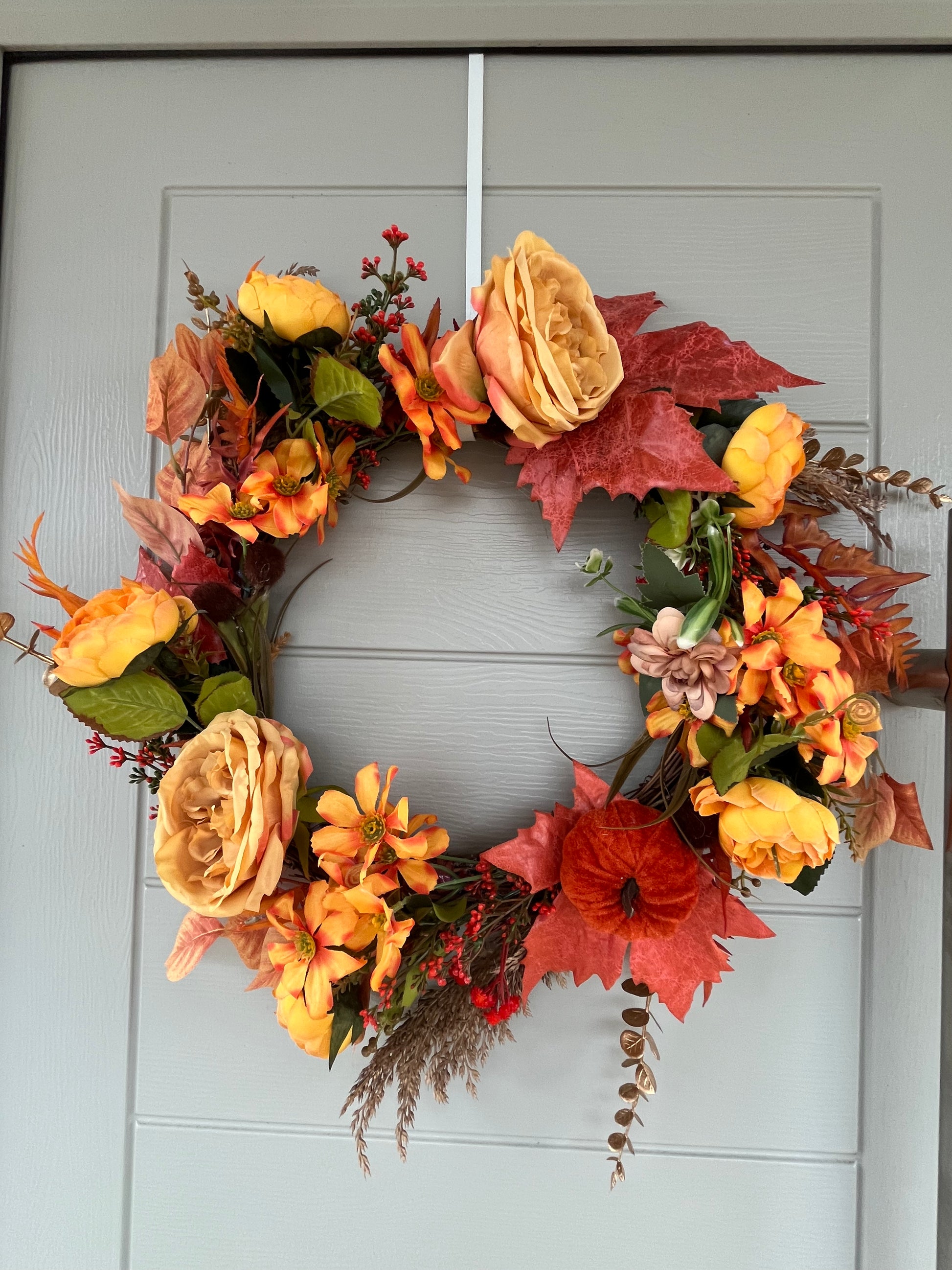 A gorgeous full Autumnal wreath with beautiful peonies as the focal point. Made on a 35cm grapevine wreath, it’s sure to make a statement on your front door this Autumn!