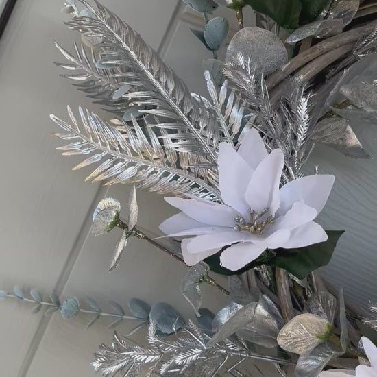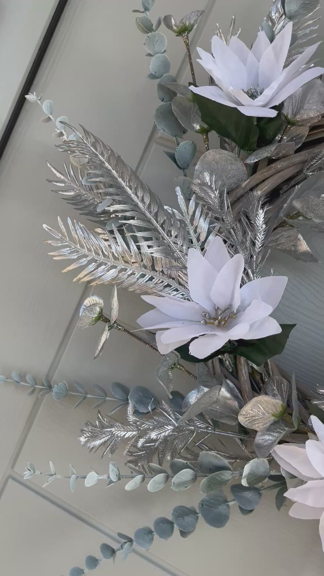 A gorgeous silver and white Winter wreath made on a willow grey base which is party exposed showing off its beauty and colour.